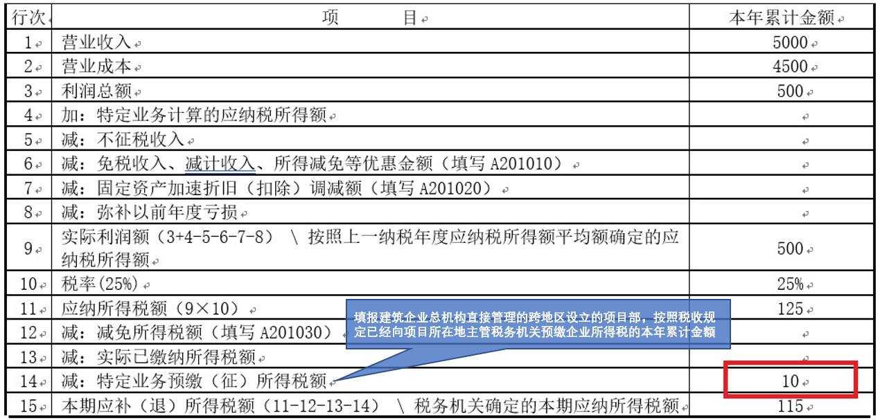 答:根据国家税务总局关于发布《中华人民共和国企业所得税月(季)度预缴纳税申报表(A类,2018年版)》等报表的公告(国家税务总局公告2018年第26号)的规定,A200000第14行“特定业务预缴(征)所得税额”:填报建筑企业总机构直接管理的跨地区设立的项目部,按照税收规定已经向项目所在地主管税务机关预缴企业所得税的本年累计金额。本行本期填报金额不得小于本年上期申报的金额。