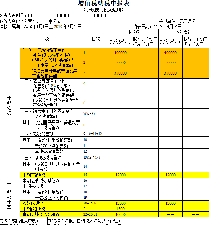 该公司2019年第1季度,应征增值税销售额合计40万元不符合增值税小微企业标准,本期应纳税额=40*3%=1.2万元,税务机关代开发票已预缴增值税1500元。