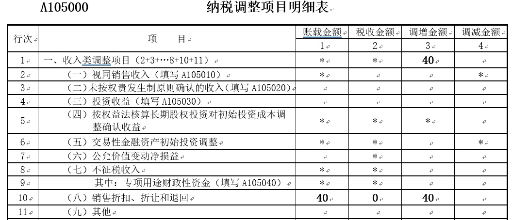 《A105000纳税调整项目明细表》第10行“(八)销售折扣、折让和退回”栏次,填报不符合税收规定的销售折扣、折让应进行纳税调整的金额和发生的销售退回因会计处理与税收规定有差异需纳税调整的金额。