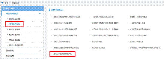 (二)在左侧综合信息报告菜单中,单击【资格信息报告】菜单,右侧显示资格信息报告业务功能表,单击【适用加计抵减政策的声明】,进入“填写申请表”页面。