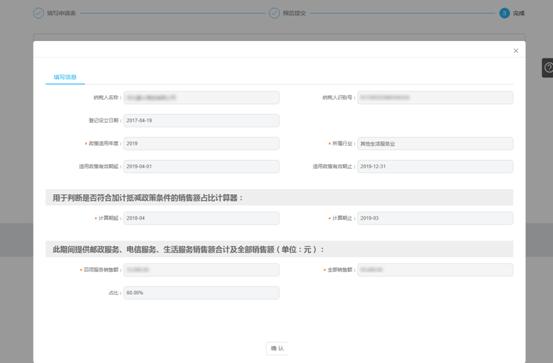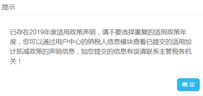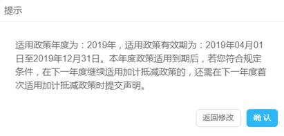 3、点击提示中的【返回修改】按钮,返回“填写申请表”页面,可对申请信息进行修改;点击提示中的【确认】按钮,提示“声明内容提交保存后,将不能修改,您是否确定提交?”,点击【确认】按钮,提交适用加计抵减政策的声明。