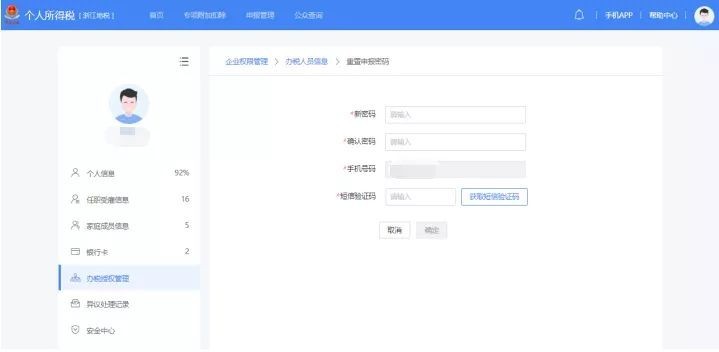 4、当账号存在已绑定的手机时,才可以直接进行申报密码的重置,如果没有,提示用户先前往安全中心绑定手机,绑定成功后才可以重置申报密码,不存在已绑定手机不能重置申报密码。