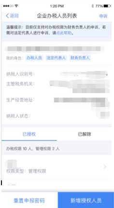 ①用户通过个人中心,进入企业办税权限,当角色是法人或财务负责人的时候,点击某个企业,可以进入重置申报密码的触发页面;