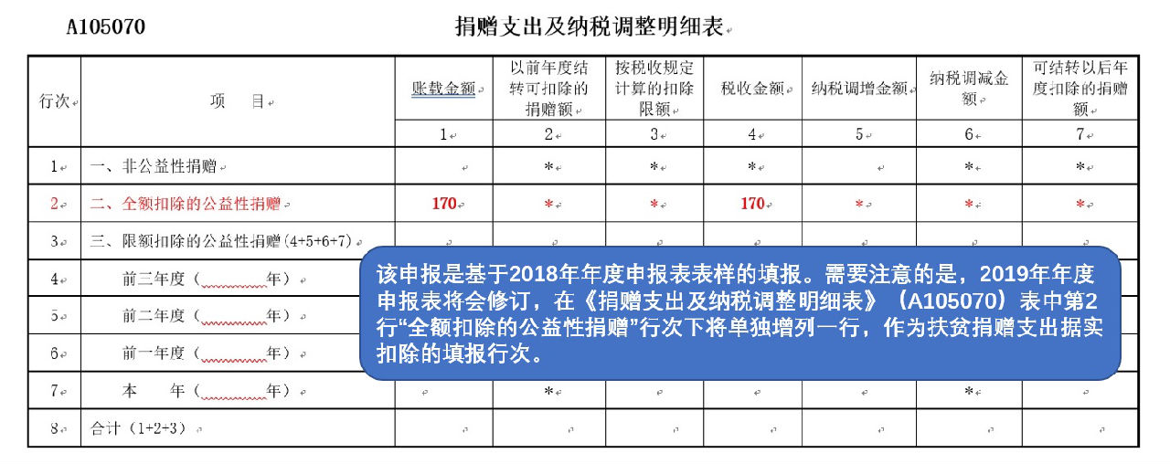 2.根据2019年04月16日国家税务总局所得税司《企业扶贫捐赠所得税税前扣除政策宣传问答》,2019年度汇算清缴开始前,税务总局将统筹做好年度纳税申报表的修订和纳税申报系统升级工作,拟在《捐赠支出及纳税调整明细表》(A105070)表中“全额扣除的公益性捐赠”行次下单独增列一行,作为扶贫捐赠支出据实扣除的填报行次,以方便企业自行申报。