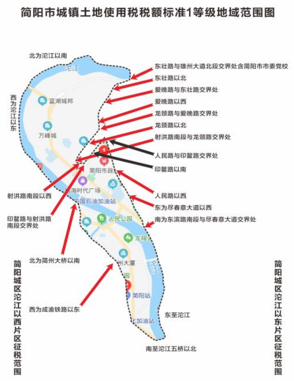 | 1 | 12 | 简阳城区沱江以东片区征税范围:西为沱江以东→南为东滨路南段与尽春意大道交界处→东为尽春意大道以西→人民路以西→人民路与印鳌路交界处→印鳌路以南→印鳌路与射洪路南段交界处→射洪路南段以西→射洪路南段与龙颈路交界处→龙颈路以北→龙颈路与爱晚路交界处→爱晚路以西→爱晚路与东壮路交界处→东壮路以北→东壮路与雄州大道北段交界处含简阳市市委党校→北为沱江以南。 简阳城区沱江以西片区征税范围:东至沱江→南为沱江五桥以北→西为成渝铁路以东→北为简州大桥以南。 |