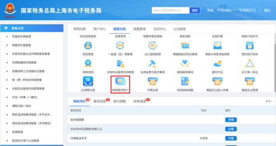 按照国家税务总局工作安排,根据《国家税务总局上海市税务局关于进一步开展全面数字化的电子发票试点工作的公告》(国家税务总局上海市税务局公告2022年第1号),上海市税务局将在前期徐汇区试点的基础上,于2022年6月25日起在全市范围全面试点应用电子发票服务平台税务数字账户,除部分纳税人外,统一通过电子发票服务平台税务数字账户使用发票用途确认、风险提示、信息下载等功能,不再通过增值税发票综合服务平台使用上述功能。
