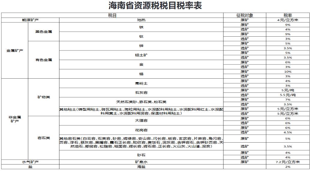 一、《资源税法》规定实行幅度税率的,本省相关资源税的具体适用税率在国家规定的税率幅度内,具体按照《海南省资源税税目税率表》执行。