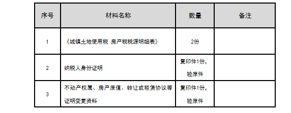 6.房产权利人名称变更纳税义务的(属应税行为减少的按变更办;应税行为增加的按新增登记办);在房产产权部门办理转让、赠与、继承、拆迁等原因发生变更或终止纳税义务的,应提供相关部门的相关证明。