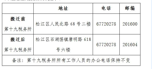 国家税务总局上海市松江区税务局关于第十九税务所办公地址搬迁的告知书