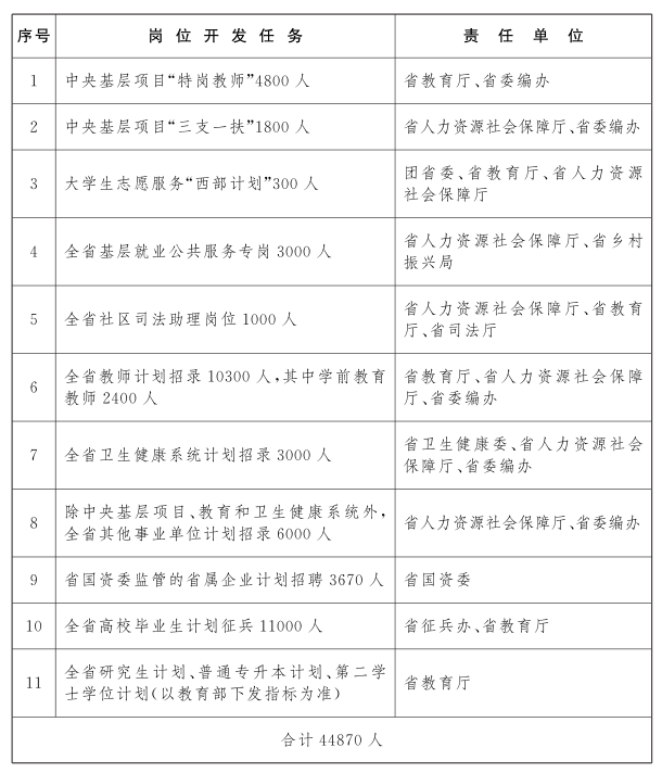 (六)加大机关事业单位招聘高校毕业生力度。各地要挖掘政府机关、事业单位编制存量。全省中小学教师计划招聘不少于10300人,其中学前教育教师计划招录不少于2400人;医疗系统计划招录不少于3000人,其他事业单位计划招录不少于6000人,面向应届毕业生的岗位不低于40%。
